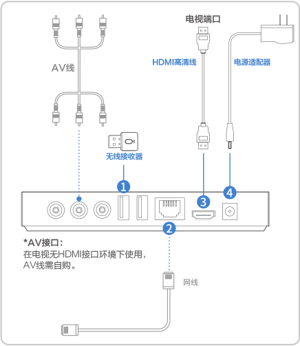 ① 自行购买AV连接线,根据AV接头接口的颜色相应连接电视机和岚正魔方;