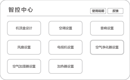 电器设置:“设置电视”、“设置空调”、“设置空气加湿器”、“我要控制音响”、“修改电视设置”